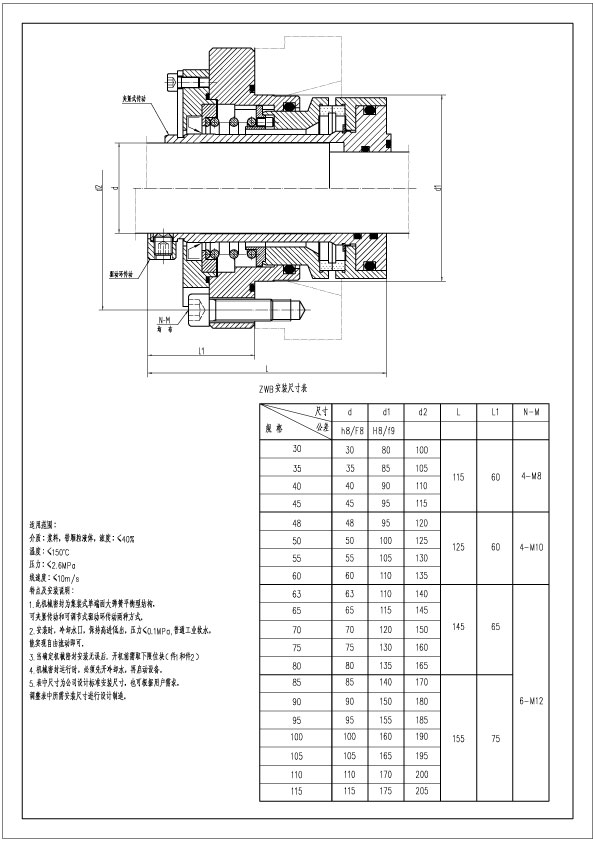 | 结构特点: | 1:此机械密封为集装式单端面大弹簧平衡型结构。可夹紧传动和可调节式驱动环传动两种方式。 2:安装时,冷却水口,保持高进低出,压力≤0.1MPa,普通工业软水,能实现自由流动即可。 3:当确定机械密封安装无误后,开机前需取下限位块。 4:机械密封运行时,必须先开冷却水,再启动设备。 5:可根据客户需求,可根据客户需要安装尺寸进行设计制造。 |